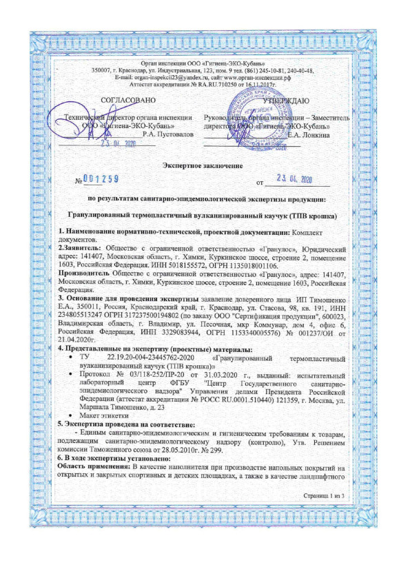 Для изготовления TPV крошки GUMBIT использует качественные полимеры, которые не содержат опасных для здоровья фталатов, цинка. Покрытия не выделяют вредных испарений (пероксиды и серу), поэтому гранулы можно использовать для обустройства детских, спортивных площадок, полей гольф клуба, городской инфраструктуры, на трапах, лестничных пролетах. В процессе добавляется бело-зеленый краситель (по палитре RAL 6019), поэтому покрытие выглядит эстетичным, можно реализовать любые дизайнерские решения.